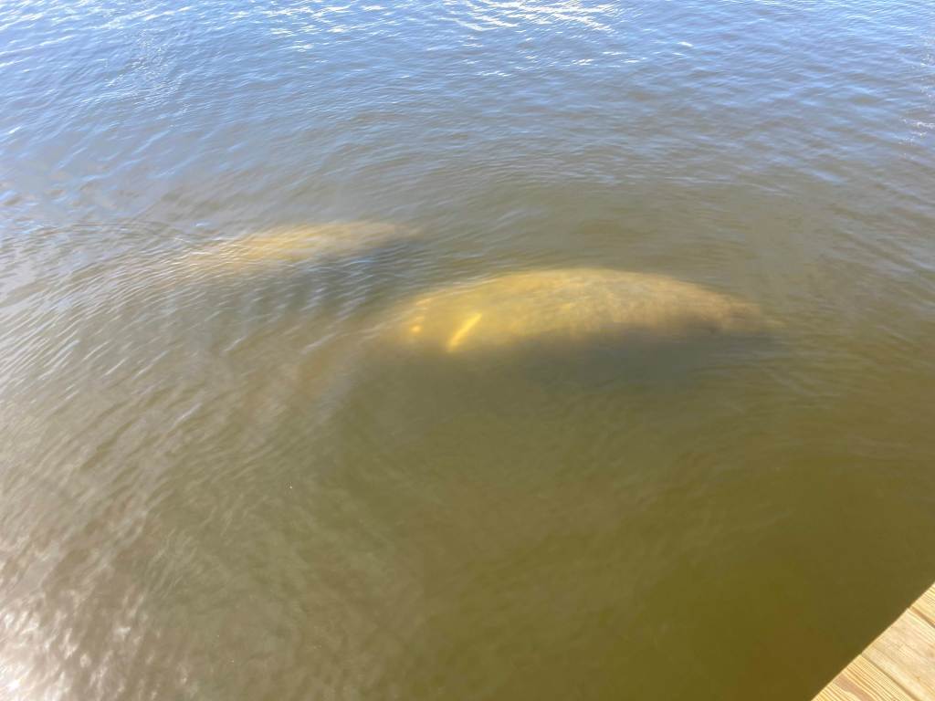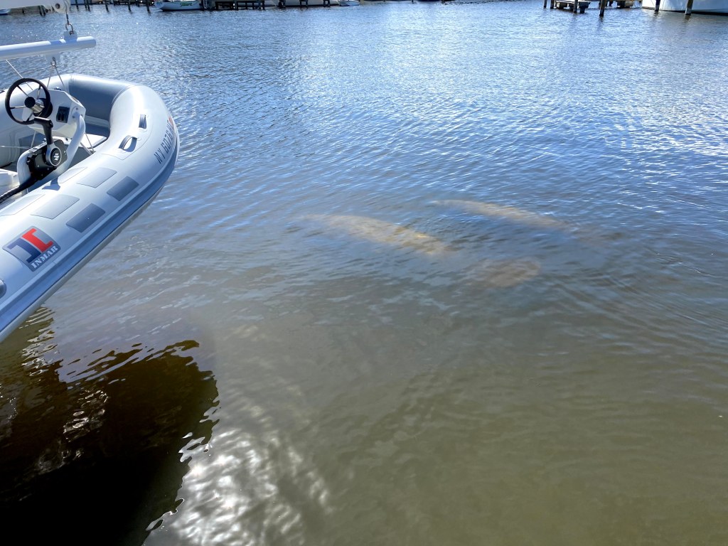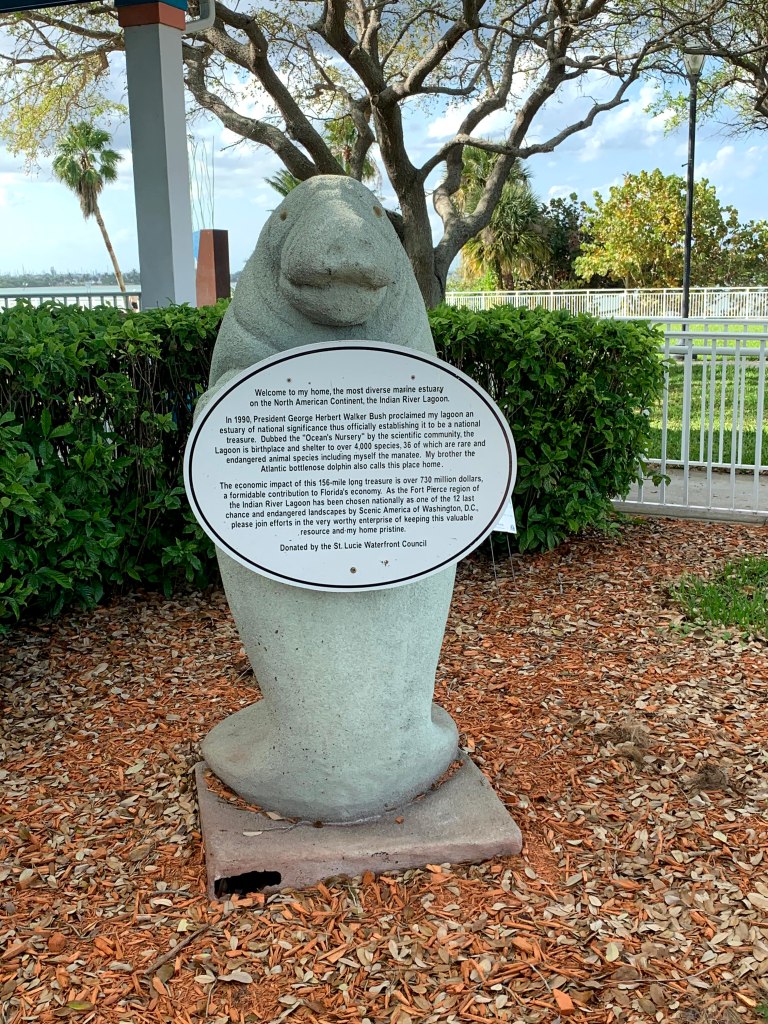 After we arrived and got settled, Peter sent a text to Rob and Claire, members of the Peekskill Yacht Club who were “snowbirds” for a few weeks. While they knew we were scheduled to stay at the marina, they also had family visiting so weren’t sure whether we would be able to get together. As it turned out, they received the text on their way to the beach and were just passing by the marina so stopped for a short visit. While they were there, we had two other visitors in the slip behind the boat, two manatees – a mother and her baby. I guess when you go looking as we did in Fort Pierce, they remain hidden and then surprise you when you least expect it. Throughout our two days at the marina, we caught more glimpses of manatees and a few dolphins.