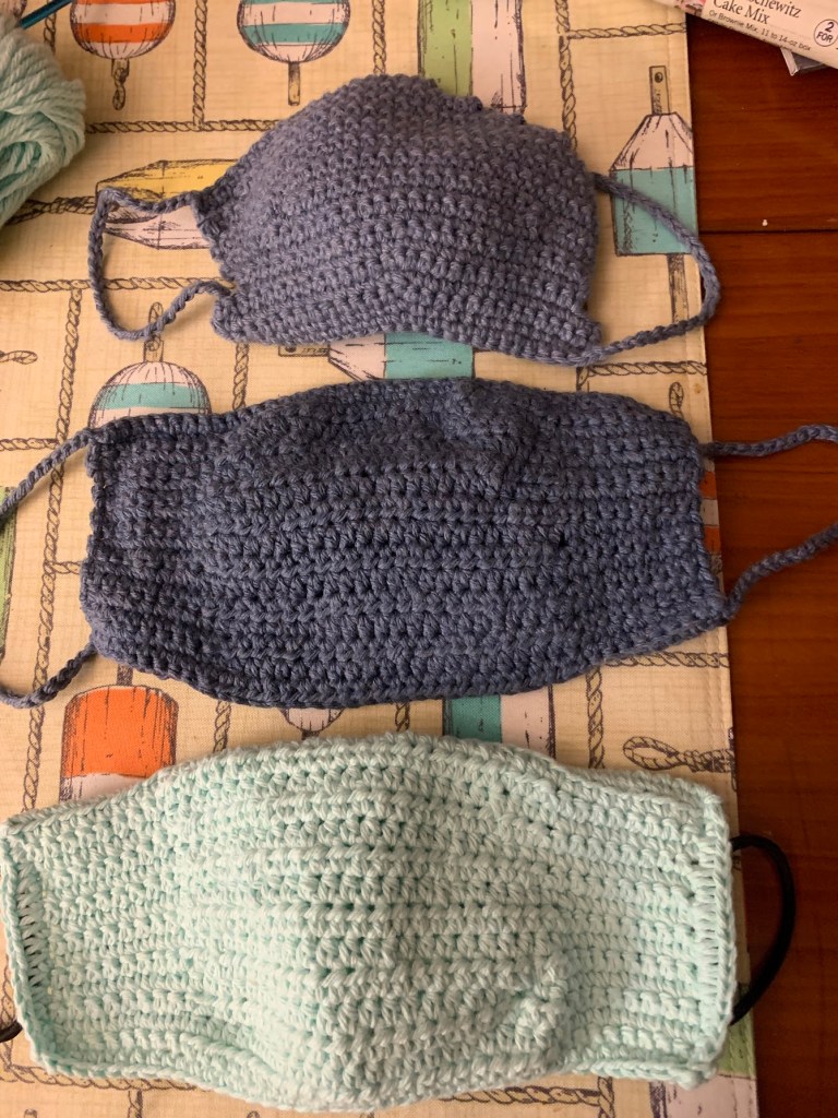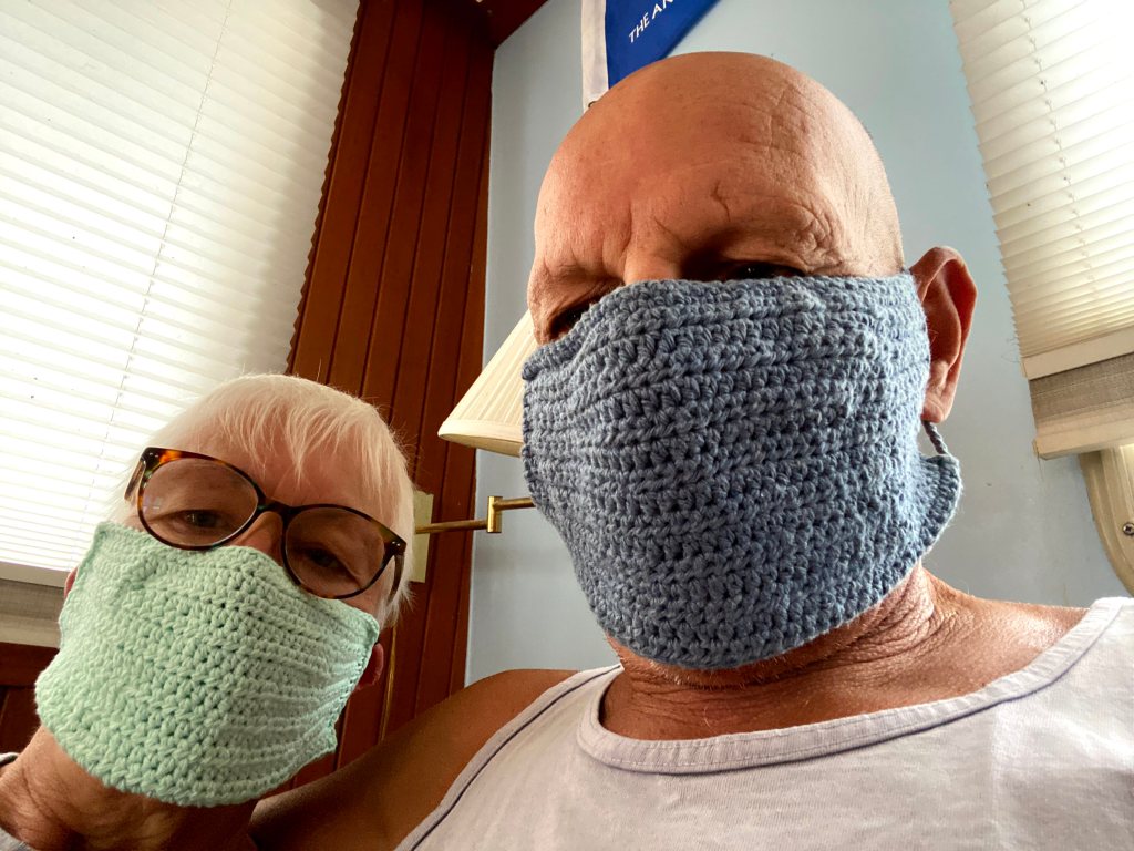 The next few days we had lots of rain and basically stayed on the boat. While we had bandana face masks, I took advantage of the lousy weather and took out my cotton yarn and crochet hook. Made masks with pockets for filters. Easy to make and then throw them in the wash and dryer. Peter posted the photo on his FaceBook accounts. The rain continued. Good thing we like to read and we have also been watching some of the original series on Amazon Prime and Netflix. Since there was so much rain we all agreed to postpone our weekly Wednesday dinner to Thursday.