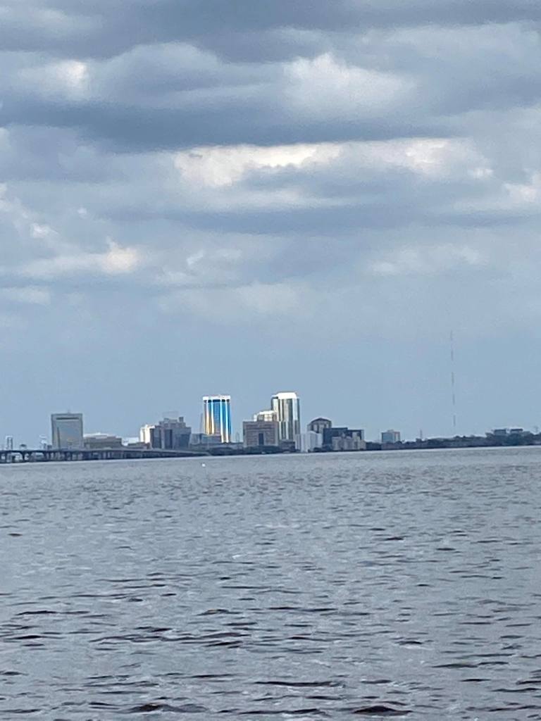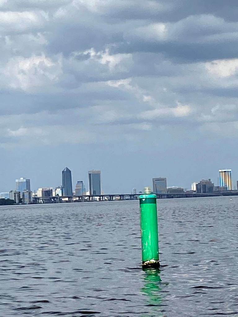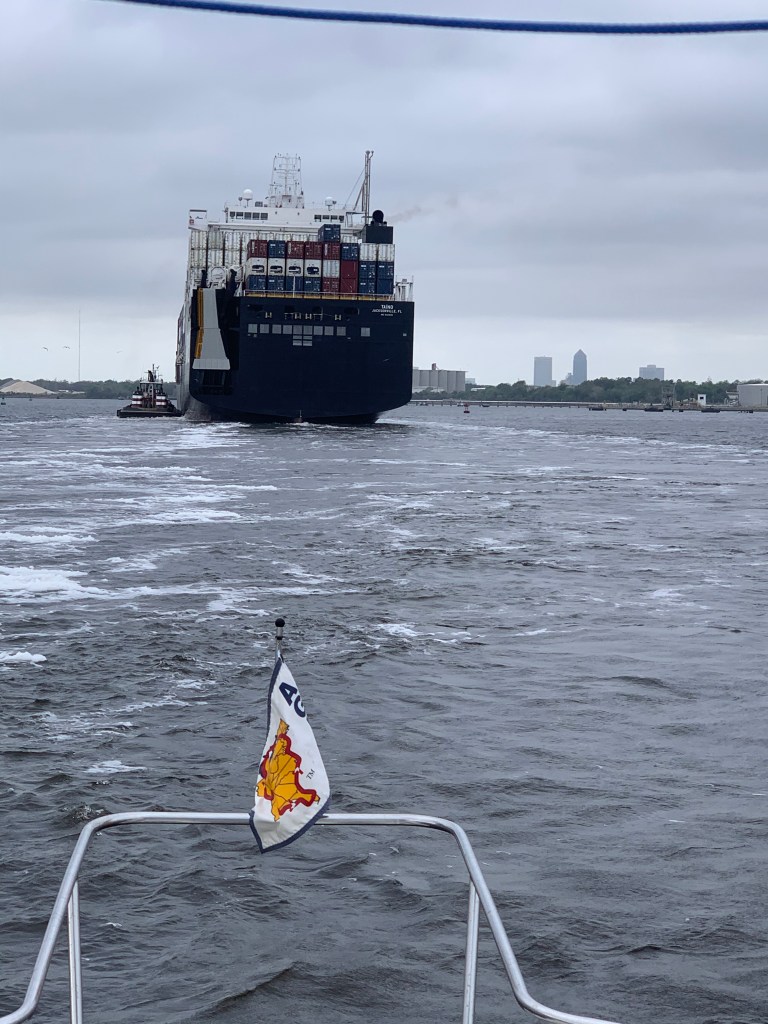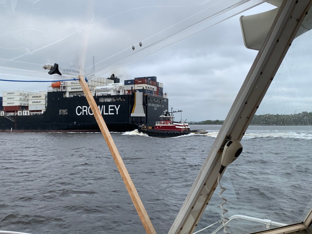 We left St Augustine on Sunday and waters were calm with little wind. The only difficulty we had resulted from it being the weekend and lots of boats, especially center consoles, were on the water with most being inconsiderate by traveling too close, not slowing down, and waking us! When we got close to the inlet, we encountered an ocean going ship that was coming into the St Johns River/Intra Coastal. While we stayed far enough away, it was still intimidating.