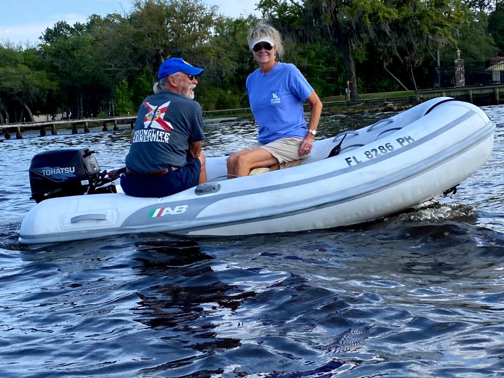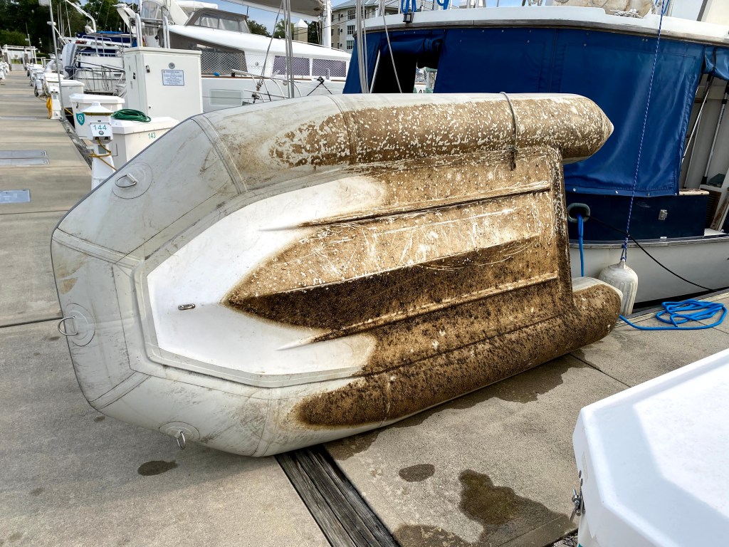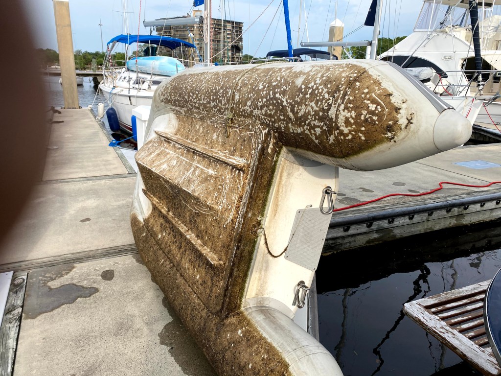 Another dinghy ride this week on the Ortega River with Maggie Jo, Odyssey, and Sabbatical. These trips have helped us all maintain our sanity and have been a safe way to socialize in addition to our weekly dinner. The dinghy has been in the water for a number of weeks and was getting dirty. Peter decided it was time to clean and when he raised it on the lift, the hull was covered in heavy algae and barnacles. He spent a good portion of the afternoon cleaning the bottom and decided to leave it on the lift and lower it each week we remain for our dinghy adventures.