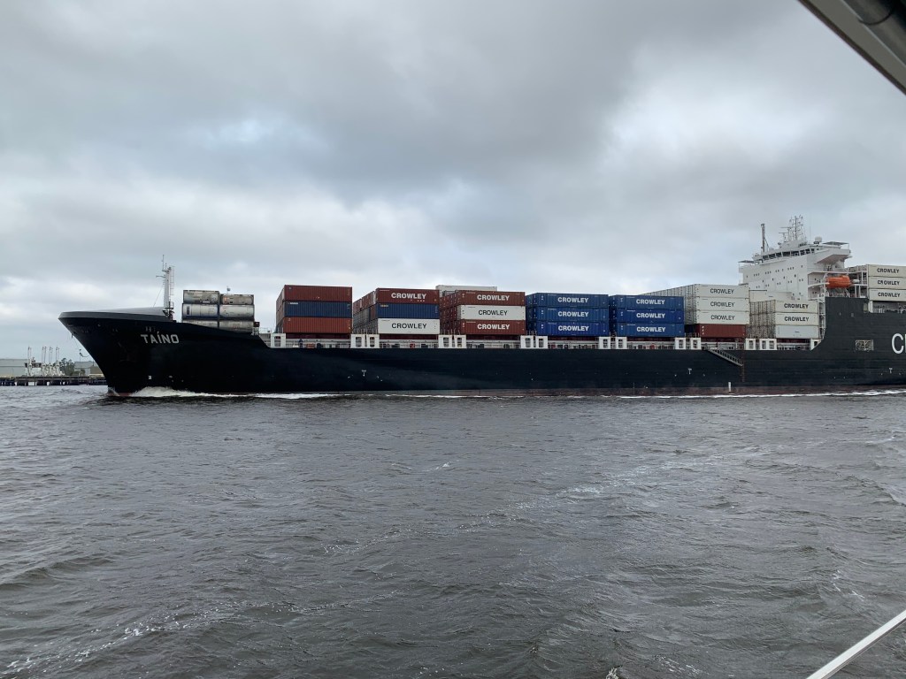 Quiet night at the dock and we timed our departure to coincide with the tide/current. Things were going well until we got squeezed by a huge (300-400’) ocean going cargo ship (Crowley) and tug in a narrow part of the channel. We were rolled pretty badly as there was no place to go.