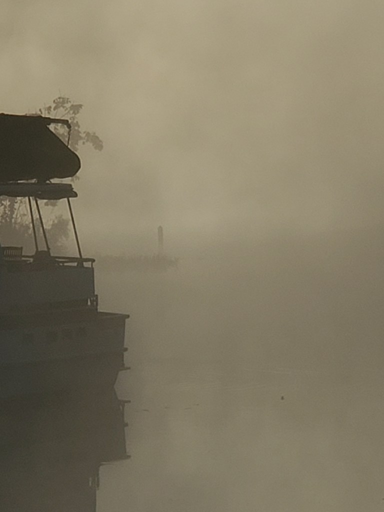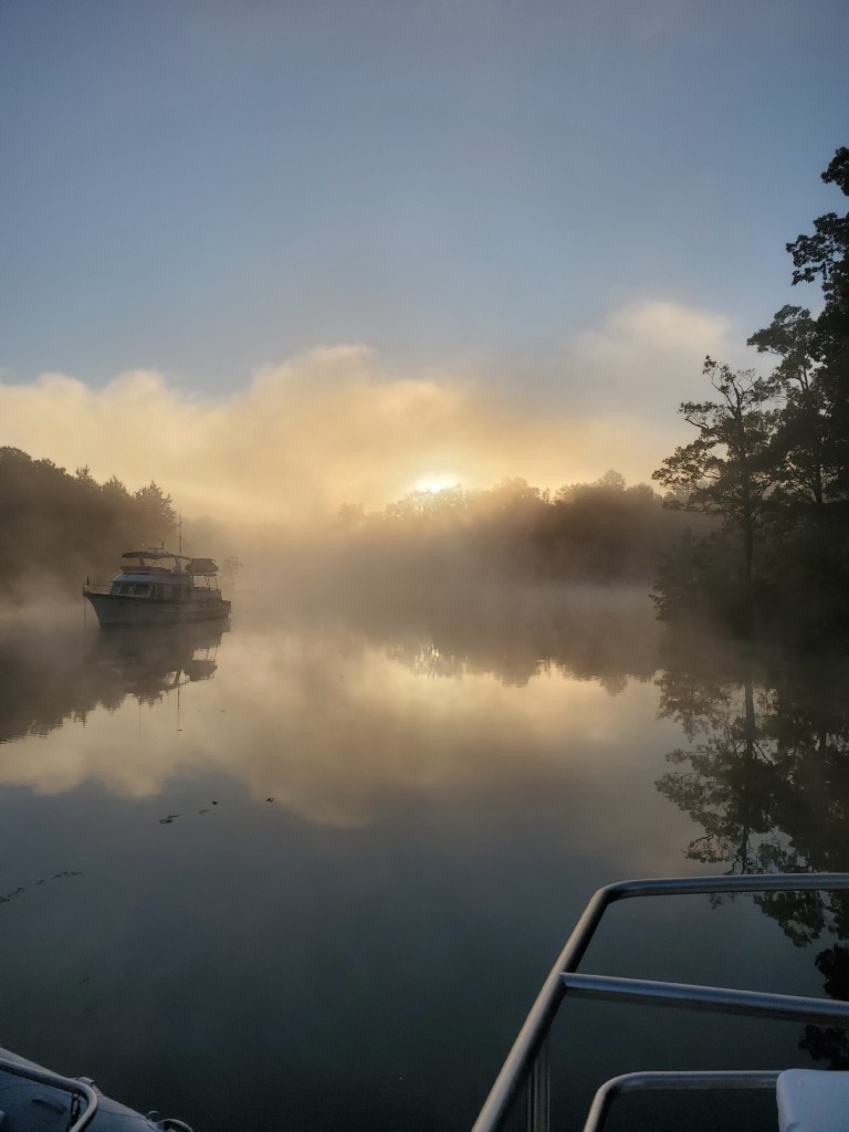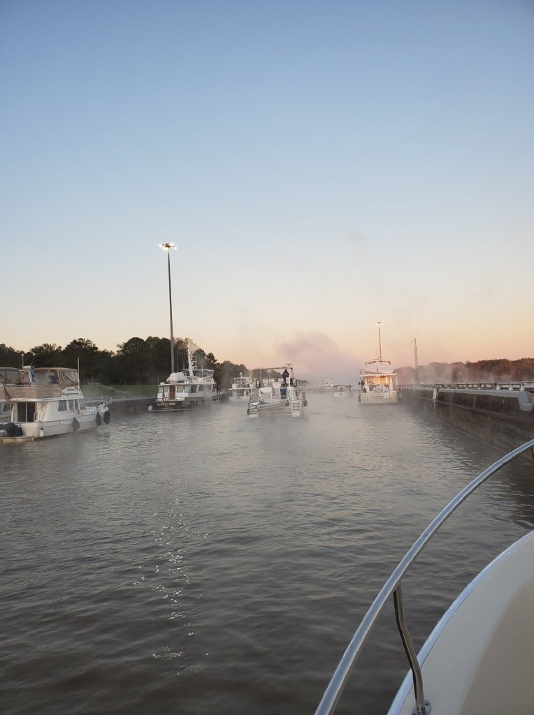 Saturday arrived and there were 13 boats leaving to go to Bobby’s. A few had planned to leave on Friday but changed their minds when they assessed the wind in the morning. Morning was a bit foggy but the lock master said it was only a little foggy so we all left. As we traveled the short distance to the lock, either the fog just moved in or the definition of “little” was different.