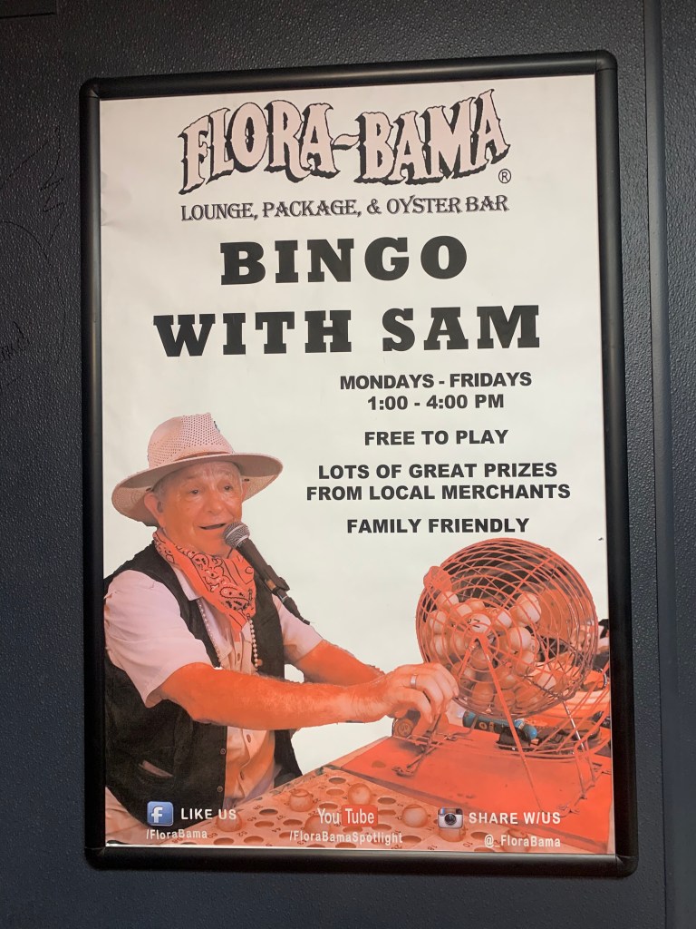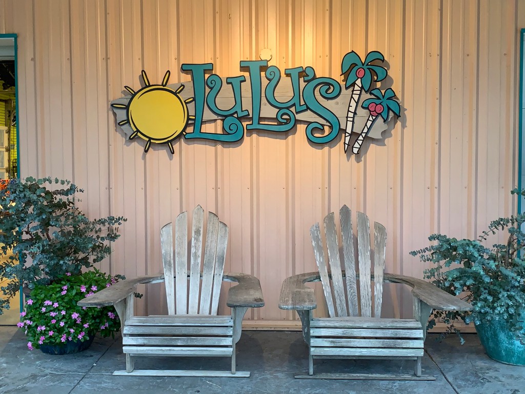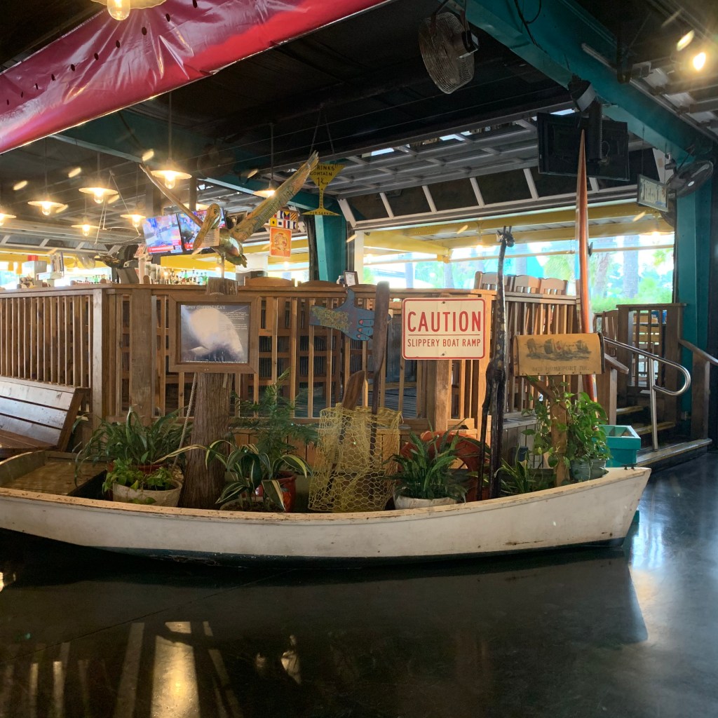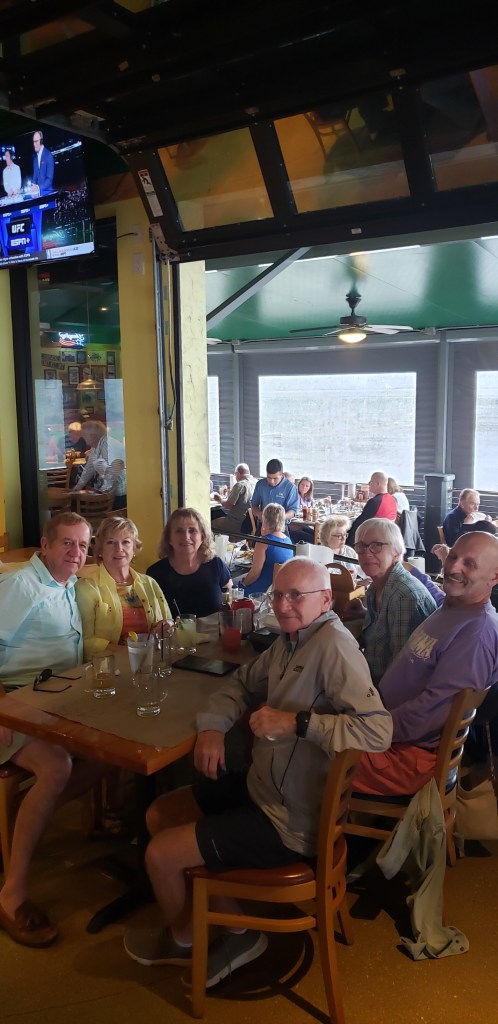 While we were at The Wharf we took an Uber to Lulu’s in Gulf Shores. Lulu’s is owned by Lucy Buffet, Jimmy Buffet’s sister and is one of the recommended restaurants in the area. Peter and I had been to Lulu’s in Destin, FL during Spring Break when we had a family vacation in Miramar Beach, FL. The vibe and food were very similar and we had a nice dinner. Another tourist activity was to visit FloraBama a huge place with multiple bars and restaurants. They even hold a non-denominational service every Sunday – the basic premise is to be a good person and treat others well. This is not your usual Sunday service. The bars are open and people bring their drinks to the service. There is live music in various bars and we also happened to be there at the beginning of an 11 day Songwriters Festival. The singer at one of the bars, Neil Dover, was good and of course sold copies of his albums but I looked him up on Apple Music and added a few of the songs we enjoyed to my library.
