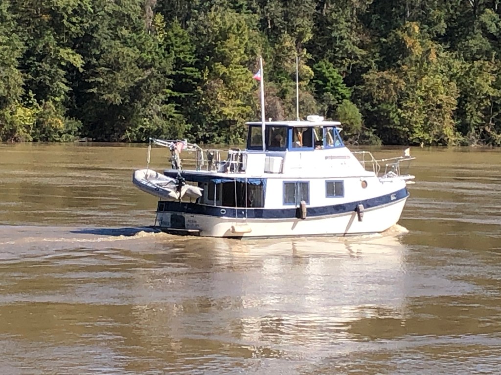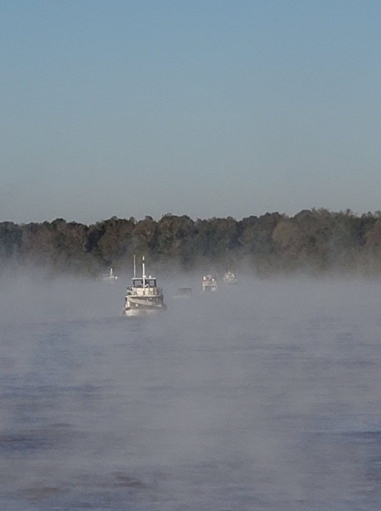 The morning brought us significant fog and the lock-master advised that we wait before traveling to the lock. After an hour or so, the fog was lifting and we saw some blue sky over the river and called the lock to advise that there were four boats coming to lock through. After locking through, we traveled a bit and then picked up one of the boats we had traveled with the day before who had anchored on the other side of the lock. The target for all five of us was Demopolis.