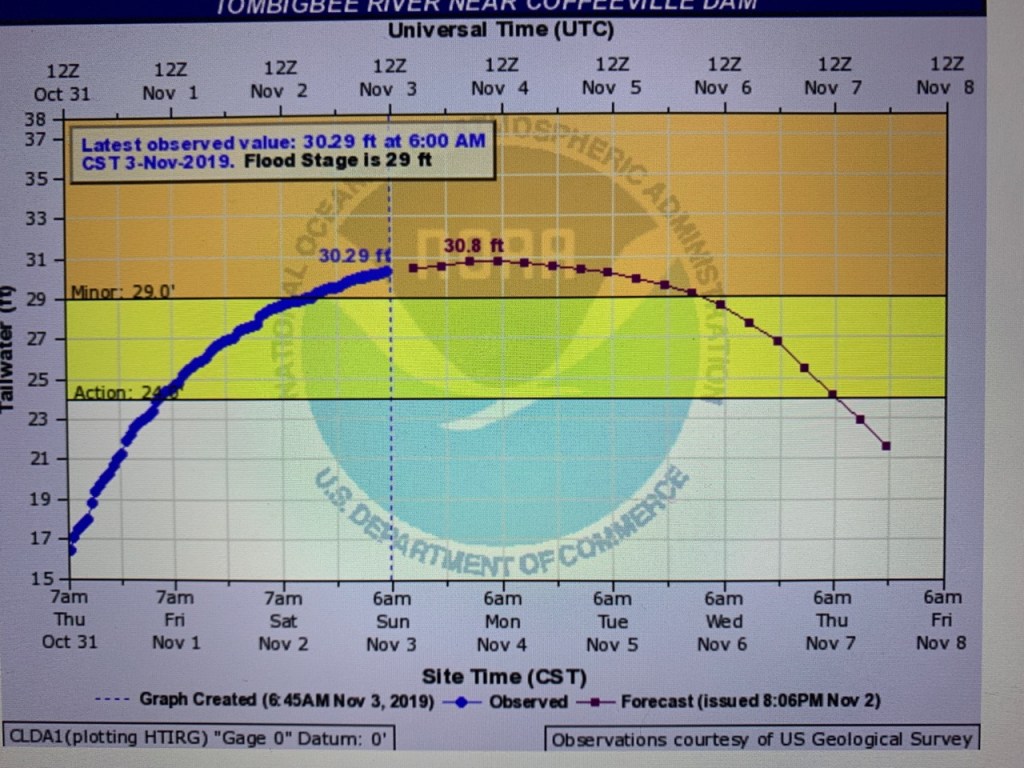 Our plan was to stay in Demopolis two days and leave on Friday, October 25th. We knew rain was expected but didn’t anticipate a major storm. That meant we needed to postpone our departure until Monday. As the days went on, things were not looking positive. There was tremendous rain and that caused flooding on the river and much debris…..lots of logs floating down river. To add to this, more rain was expected for at least three more days so that meant we would be here at least a week.