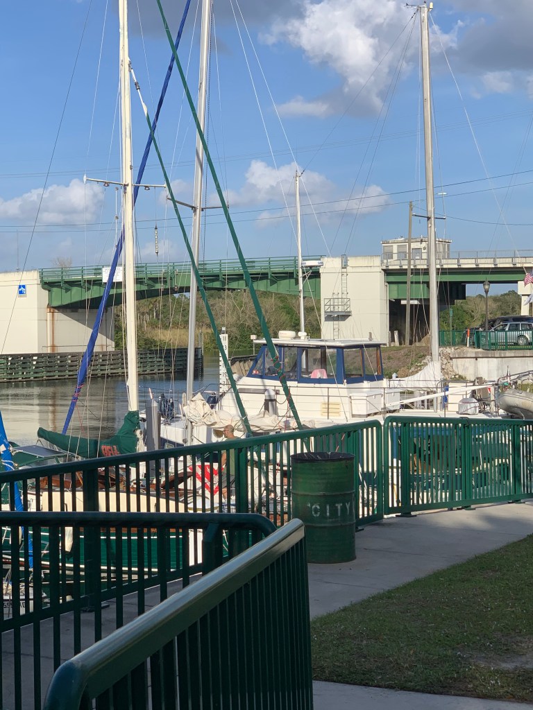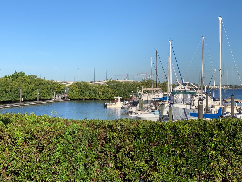 At Lighthouse Marina we could see the construction projects going on. In the past, the marina had a courtesy car and laundry and now, both are non-existent. There is another marina across the bridge (about a mile) that has an agreement for transients to come to their marina and use their restrooms with a shower and their one washer/dryer. We were scheduled to stay for three nights since a weather front of rain was moving in so the day before we left, we walked to the marina to do laundry as the next two on our list did not have working machines either. While the laundry was getting done, we walked around the town and realized that there was little on that side of the bridge and would need to walk in the other direction from Lighthouse to re-provision. Later that afternoon, I walked to Publix and with the help of my boat cart, I was able to purchase fresh supplies. In all, a total of 7.5 miles walked that day.